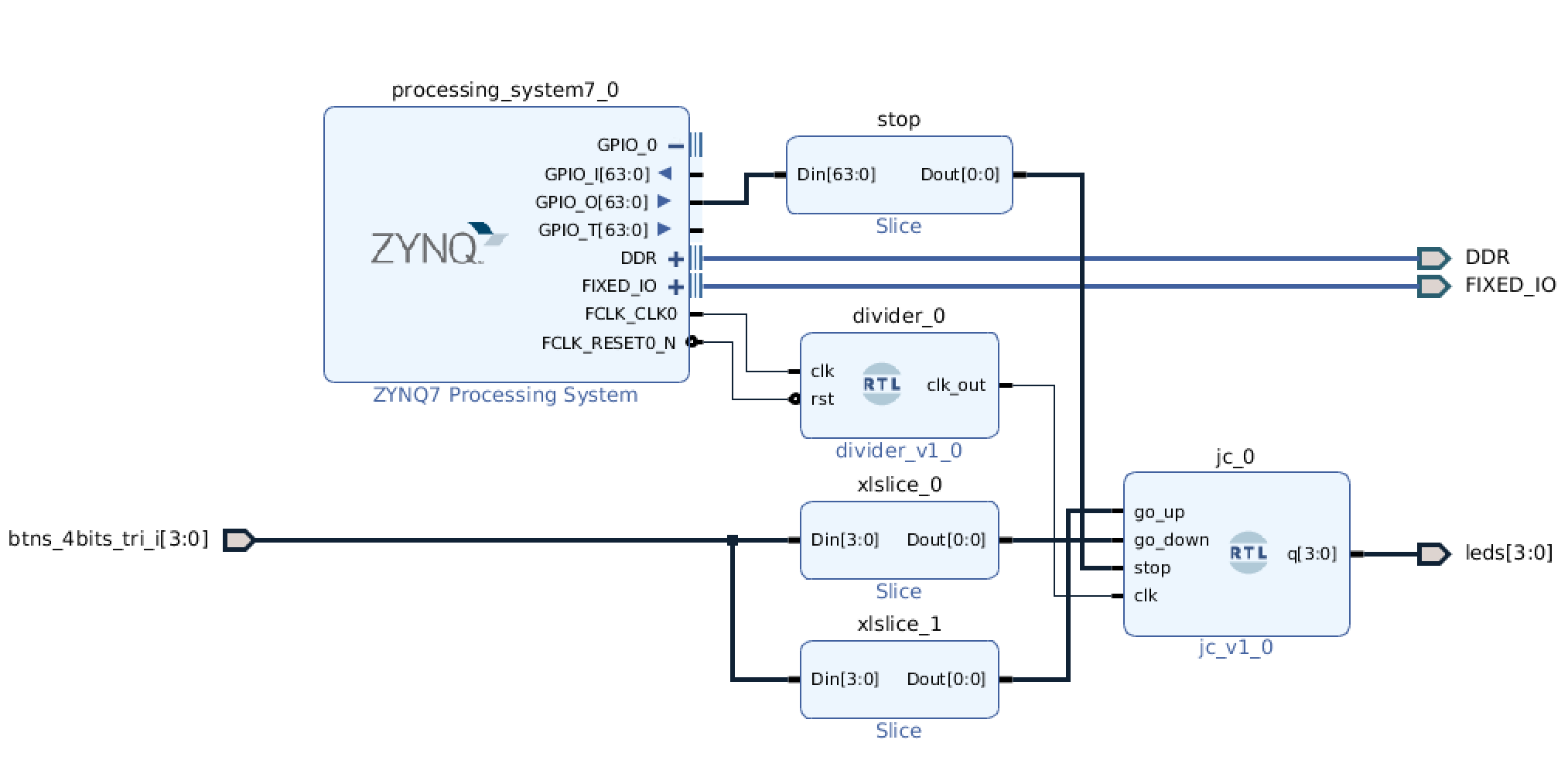 We now want to interface to some outside connections that the PL is connected to. In particular we want to interface to the buttons and to the LEDs on the PYNQ board.
