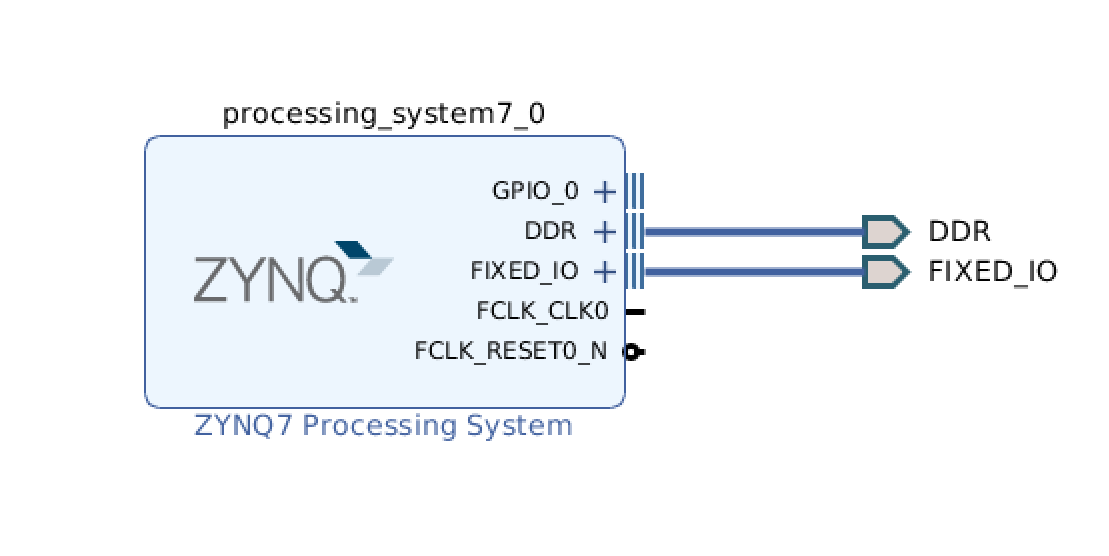 * Some new wires should appear as well as some **`External Interfaces`** labeled `DDR` and `FIXED_IO` which correspond to output pins (a subset of the output pins can be accessed by the PL, and a subset can be accessed by the PS)