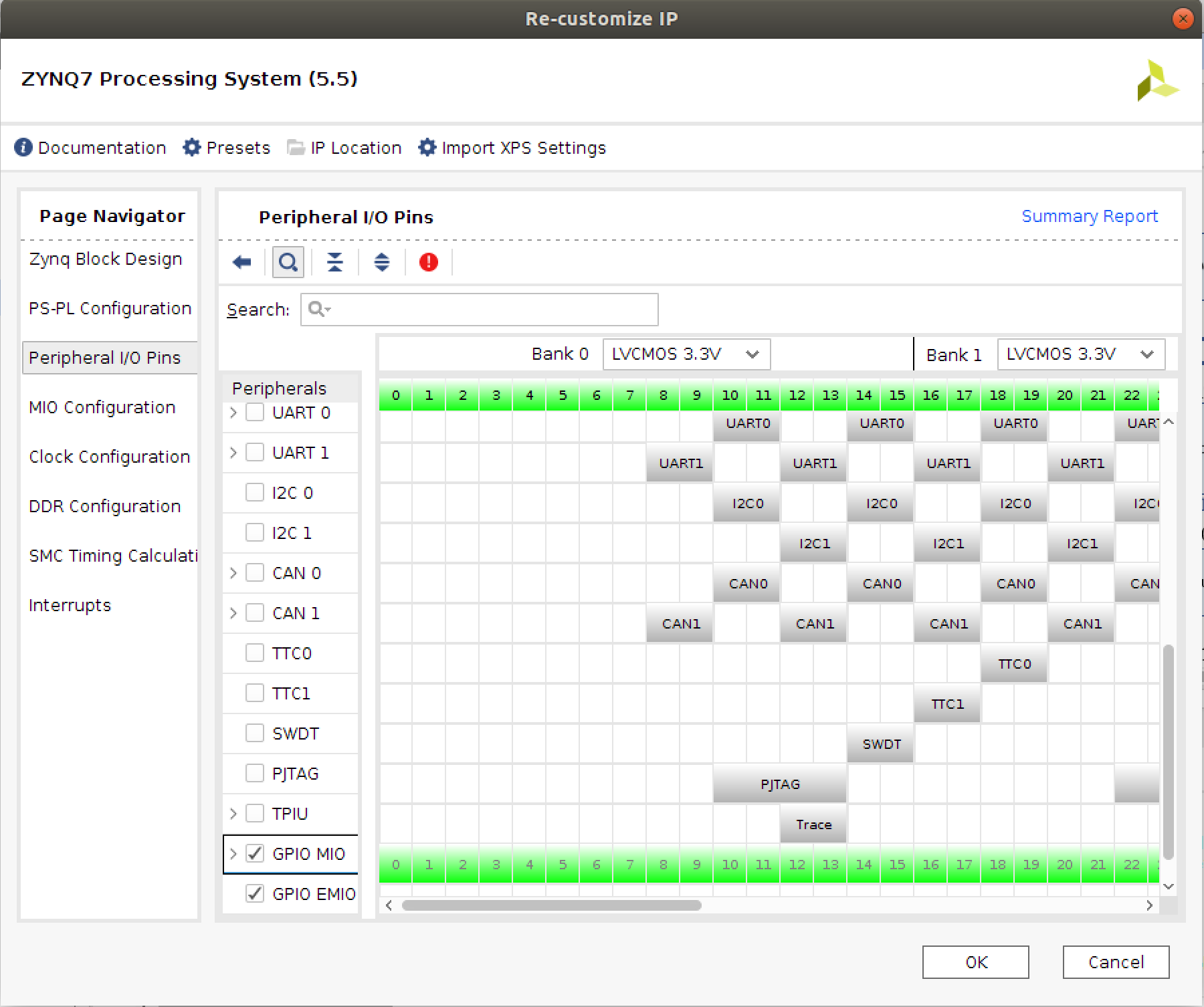 7. Next we want to enable some GPIO pins on the PS. To do this click on the **`Peripheral I/O Pins`** tab and scroll to the bottom, selecting **`GPIO MIO`** and **`GPIO EMIO`** like shown below (you'll note the pins will turn green indicating they are in use) At the same time make sure to disable all other uses for these pins (Flash SPI, UART, etc)