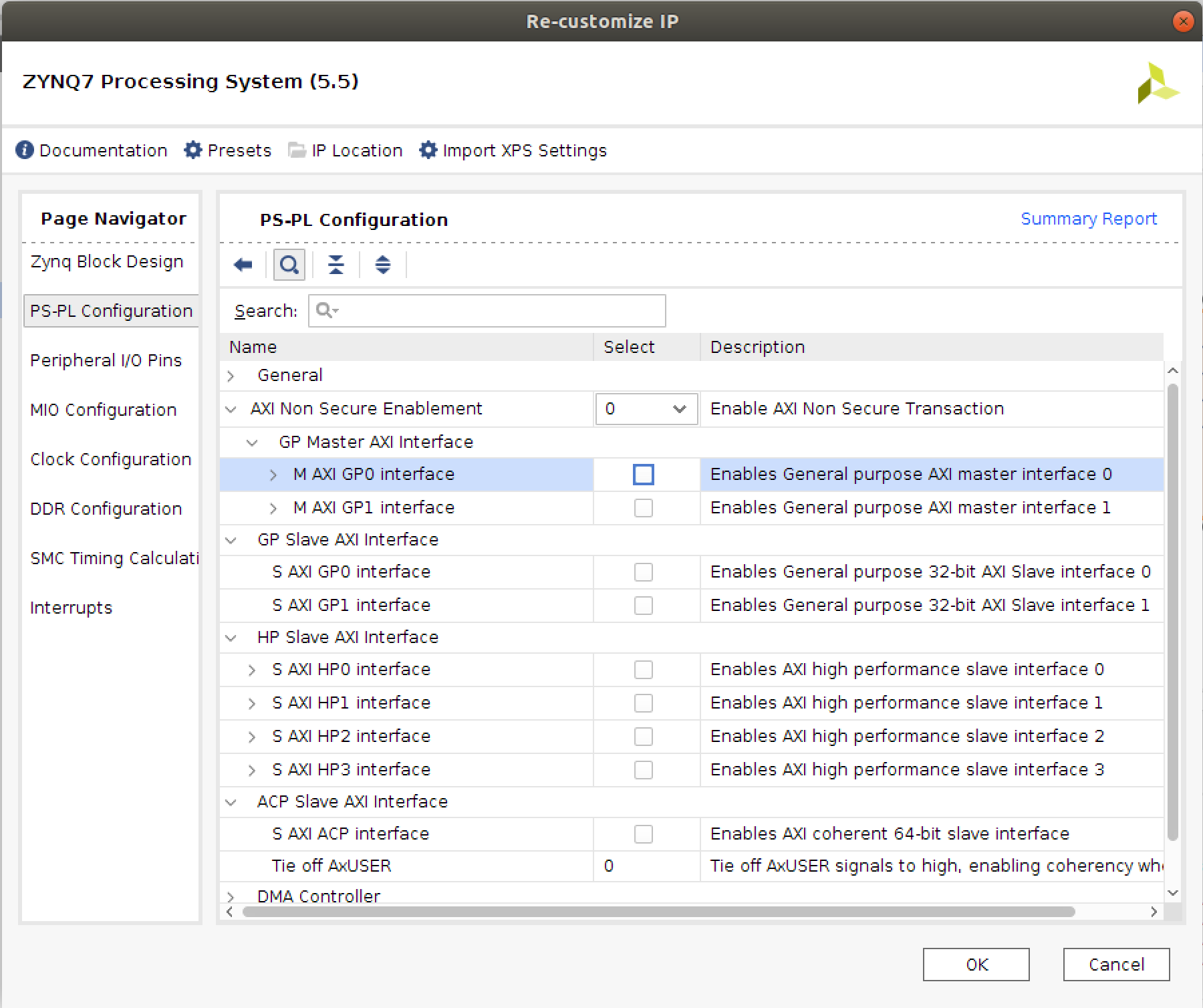 6. We now need to customize the Zynq PS for our purposes. To do this double click on the module. First off we're going to disable the AXI ports that connect the PS to the PL directly. (We'll use those later in other labs or in projects). Go to the **`PS-PL`** configuration tab and make sure no options are checked. It should look similar to below: