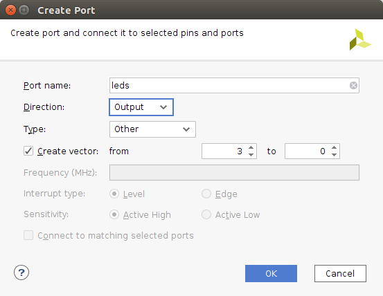 2. Next, go back to the block diagram, and **`Right Click > Create Port`** or press Control-K. This will bring up the option to create inputs and outputs to the PL. Create two ports, an input for the buttons and an output for the LEDs. Should make sense: