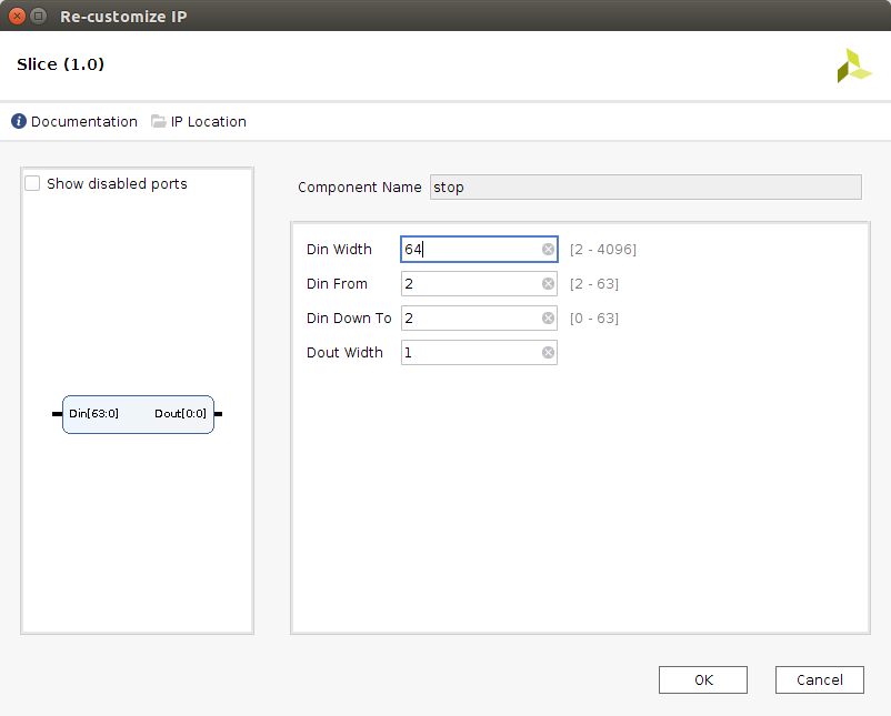 * For the one that slices the Zynq PS GPIO, make its input width (**`Din`**) be 64. Then make both **`Din From`** and **`Din Down To`** have a value of 2. This is telling the slicer to take in all 64 values and only put out value on pin 2.