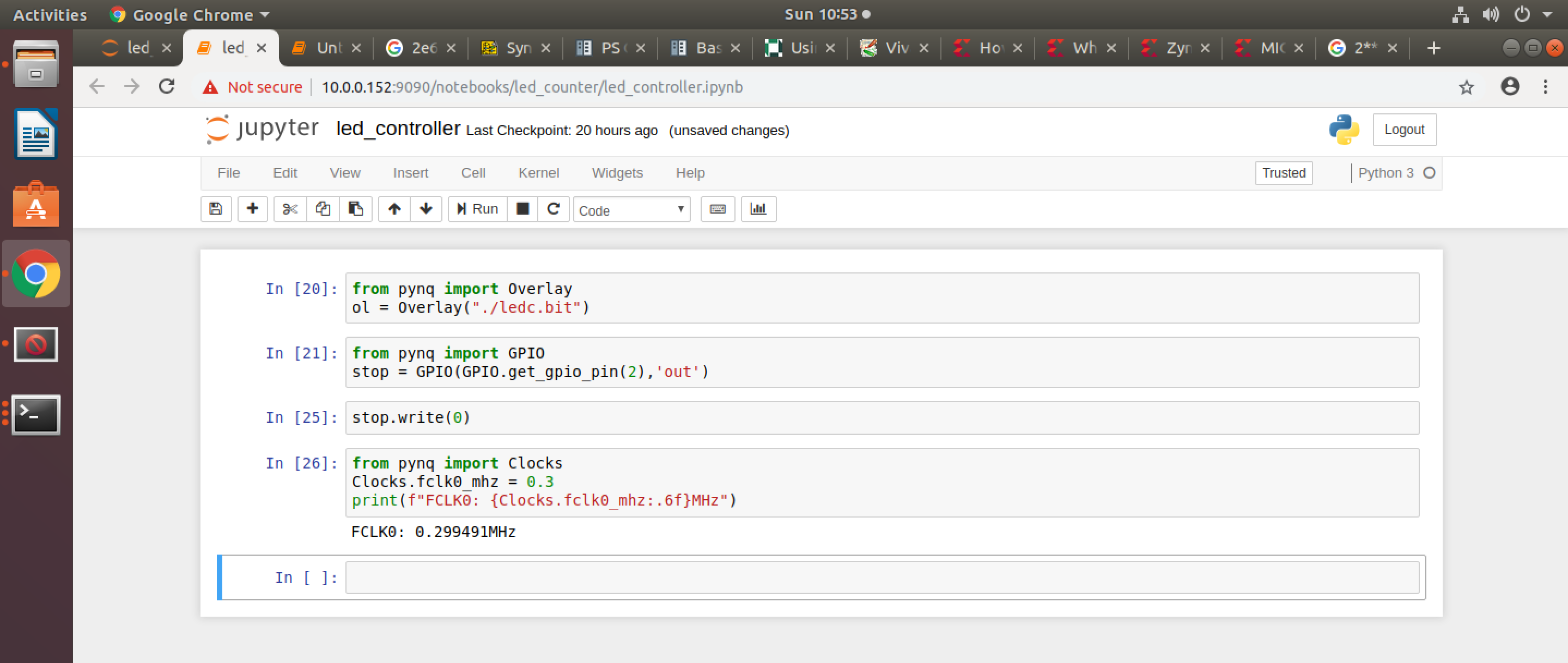This code imports the `Overlay` library which we then use to load the bit file we just generated. When you do this, the library looks for the similarly named tcl file, which should be located in the same directory (you moved that in right?). When that gets done and checked, you should be good to move on. If you run this blob, you should see your LEDs come on (but probably not be visible sweeping left or right)...or they might be just barely visibly flickering...the problem is our clock is still too high in frequency. We'll fix that in a little bit.