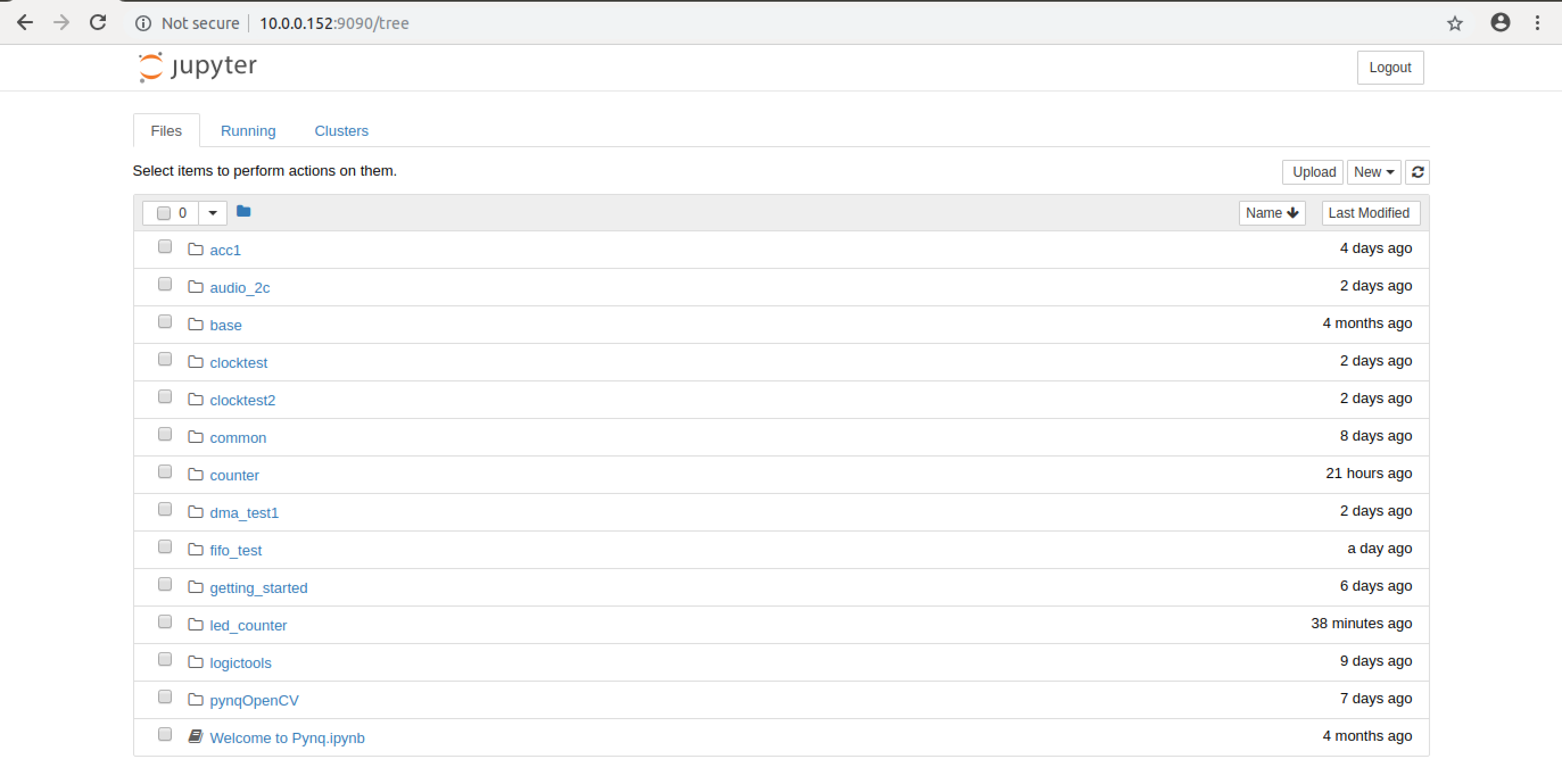 If you do the Jupyter approach, in a web browser (on the same network as your router that the Zynq is connected to), type in the IP address of your board. It'll prompt you to log in. Again, the password is `xilinx`. When there, feel free to make a new directory and/or move folders and files around. I made a directory called `led_counter` and put the `ledc.tcl` and `ledc.bit` file into it. Then I moved into that directory and created a new Python3 notebook.