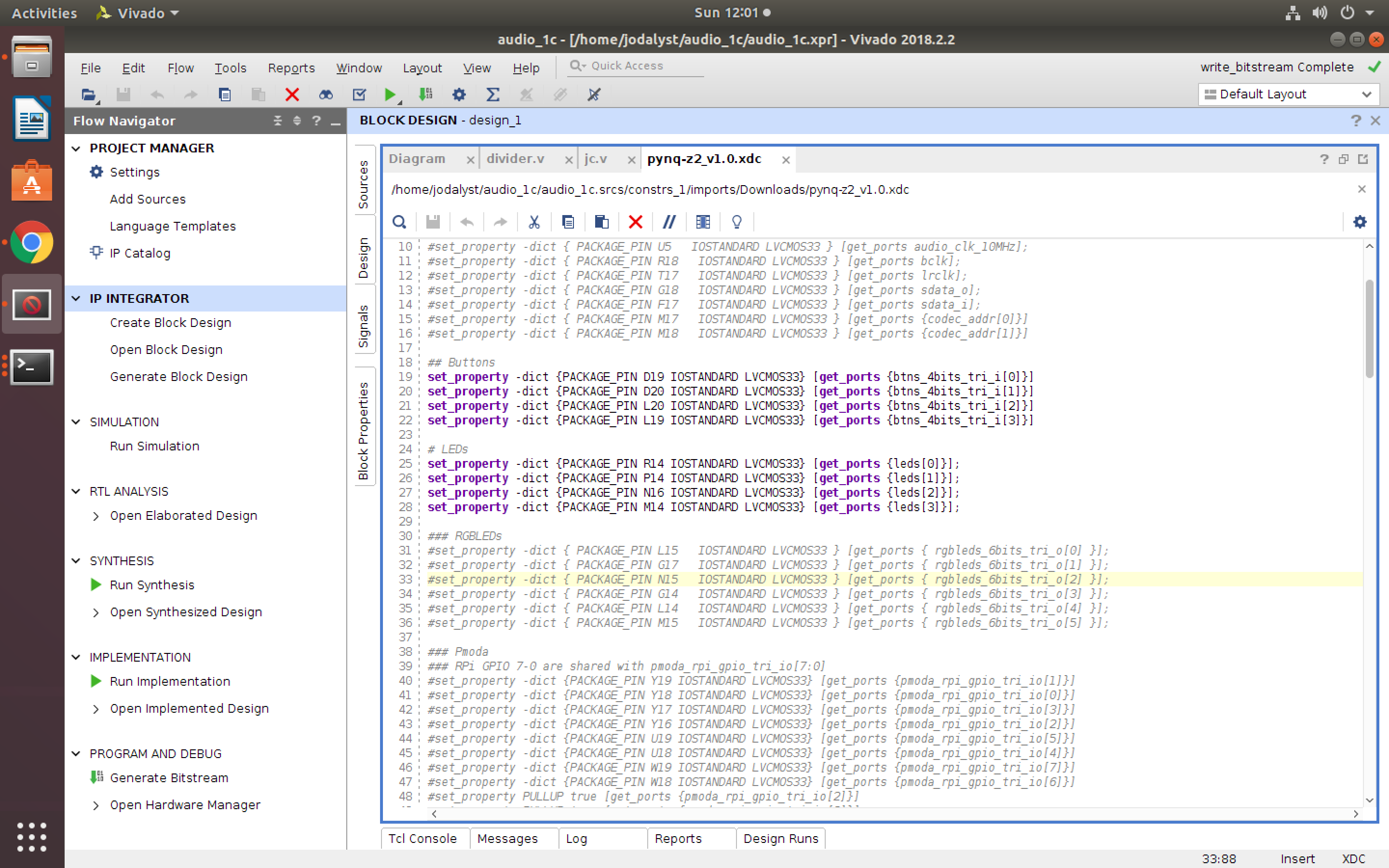 [^xdc] The XDC file essentially maps the cryptically named pins on the FPGA (names like D19 and R14) to meaningful names that we can use in our designing. When building the bit file up, Each active pin also requires some setup/interfacing to be built around it so make sure to only uncomment pins that you're using otherwise you'll make your build times unnecessarily long (and they are already long as it is).